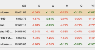 Dow Jones quay đầu giảm sau 3 phiên tăng liên tiếp Chỉ số Dow Jones giảm điểm trong ngày 11/02, chấm dứt chuỗi tăng ba phiên liên tiếp, khi báo cáo việc làm tháng 1 vượt kỳ vọng không đủ sức tạo ra một đà tăng bền vững. Nguồn: VietstockFinance …