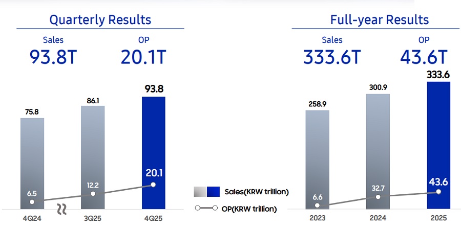 Quý 4/2025, Samsung ghi nhận doanh thu hợp nhất đạt 93.8 ngàn tỷ won (khoảng 1.66 triệu tỷ đồng), tăng 24% so với cùng kỳ năm trước. Lợi nhuận hoạt động tăng mạnh lên 20.1 ngàn tỷ won (khoảng 378 ngàn tỷ đồng), gấp 3 lần so với quý 4 năm trước.