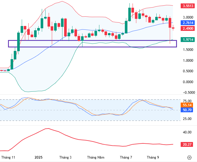 Trong khung đồ thị tuần, giá của XRP đã phục hồi sau một cú giảm mạnh về kiểm tra lại vùng đáy cũ tháng 04/2025 (tương đương vùng 1.36-1.93 USD) và hiện đang trong trạng thái giằng co dưới đường Middle của Bollinger Bands. Điều này cho thấy triển vọng không mấy lạc quan của đồng tiền này vẫn đang hiện hữu.