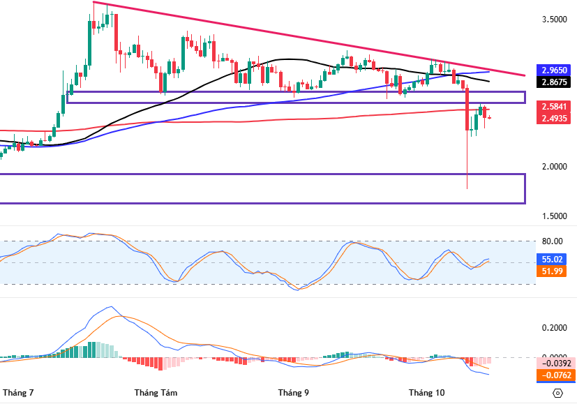 Thêm vào đó, XRP đang hình thành một nhịp phục hồi (Pullback) để kiểm tra lại cạnh dưới (tương đương vùng 2.65-2.7 USD) đã bị phá vỡ trước đó của mẫu hình Descending Triangle trong khi chỉ báo MACD vẫn đang cho tín hiệu bán và liên tục tạo các đỉnh và đáy mới thấp hơn (Lower High, Lower Low). Điều này cho thấy rủi ro giảm giá trong ngắn hạn vẫn còn.