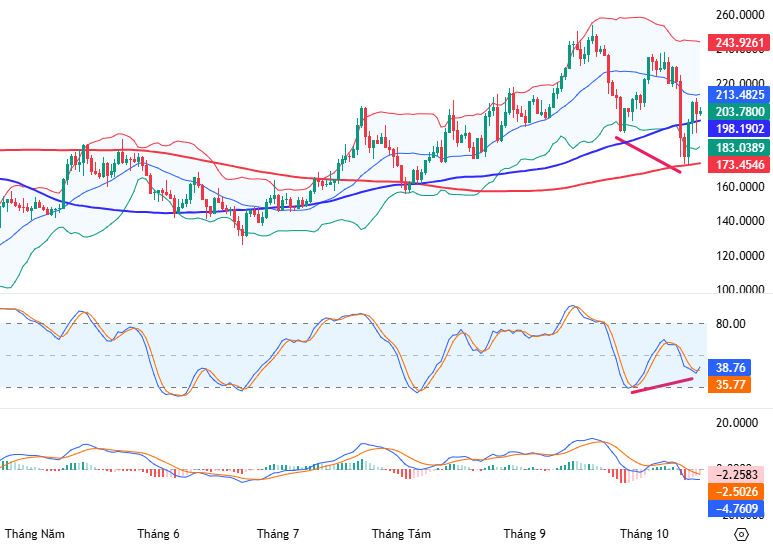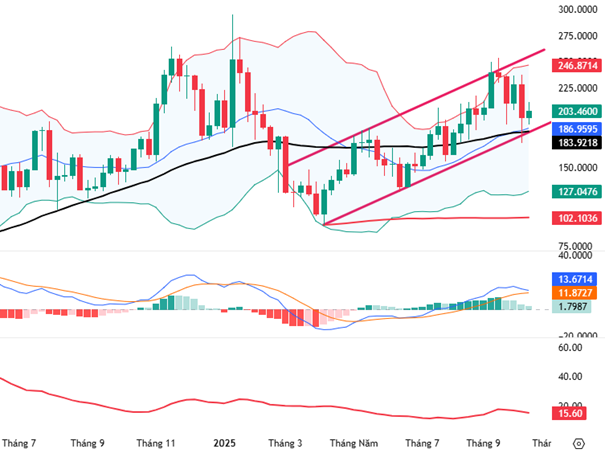 Hiện tại, giá của đồng tiền này vẫn đang được nâng đỡ khá tốt bởi cạnh dưới (tương đương vùng 174-191 USD) của kênh giá tăng (Bullish Price Channel) trung hạn trong khi chỉ báo MACD dần thu hẹp khoảng cách với đường Signal. Nếu chỉ báo không có sự cải thiện và cho tín hiệu bán thì kịch bản SOL phá vỡ vùng hỗ trợ này sẽ tăng cao trong thời gian tới.