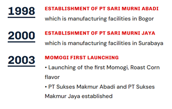 Năm 2003 đánh dấu cột mốc đặc biệt quan trọng khi SMA ra mắt thương hiệu Momogi với sản phẩm bắp nướng đầu tiên, đồng thời thành lập thêm hai công ty con PT Sukses Makmur Abadi và PT Sukses Makmur Jaya.
