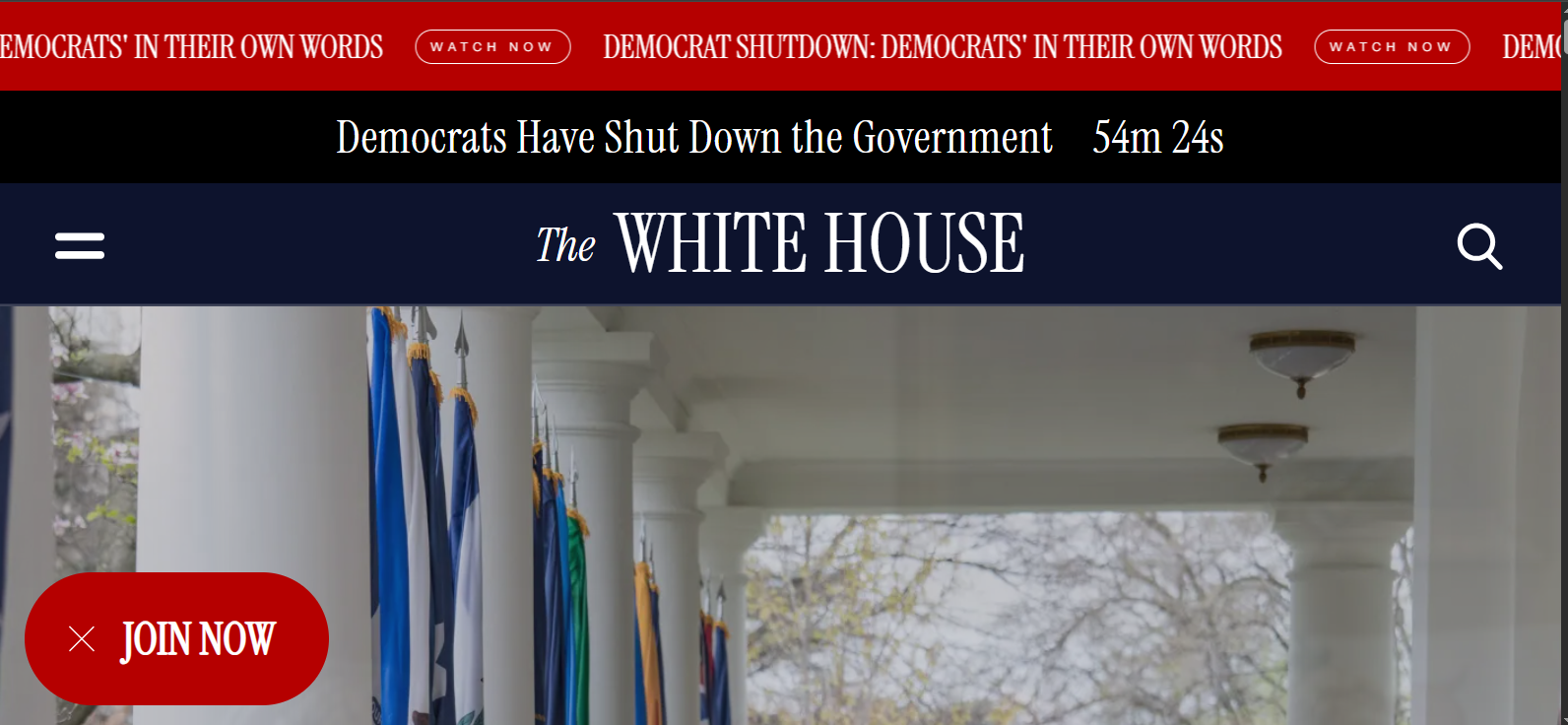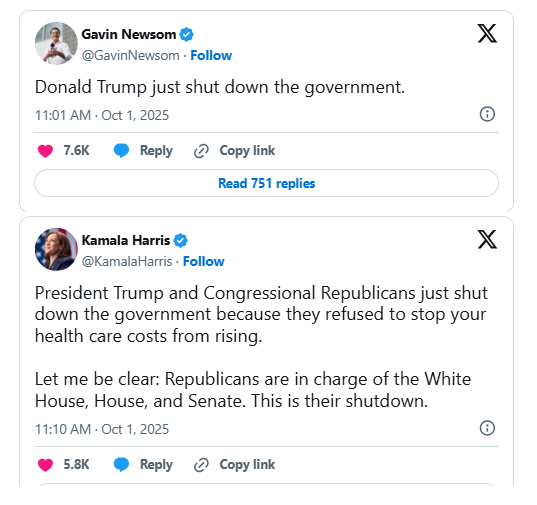 Sự kiện này lập tức đã trở thành tâm điểm của cuộc chiến đổ lỗi chính trị. Trang web Nhà Trắng đã đăng dòng chữ “Đảng Dân chủ đã đóng cửa Chính phủ” ngay sau nửa đêm, kèm theo đồng hồ đếm thời gian kể từ khi việc đóng cửa bắt đầu. Ngược lại, Thống đốc California Gavin Newsom, Đảng viên Dân chủ, đã tuyên bố trên mạng xã hội X: “Chính ông Donald Trump vừa đóng cửa Chính phủ”.