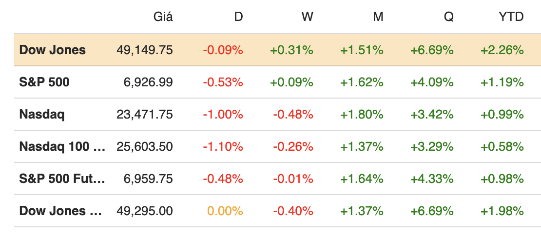 Khép phiên ngày 14/01, chỉ số S&P 500 giảm 0.53%, chốt phiên tại 6,926.60 điểm. Dow Jones mất 42.36 điểm, tương đương 0.09%, xuống 49,149.63 điểm. Nasdaq Composite giảm mạnh hơn, mất 1% và đóng cửa ở 23,471.75 điểm. Đây là phiên giảm thứ hai liên tiếp của cả ba chỉ số chính.