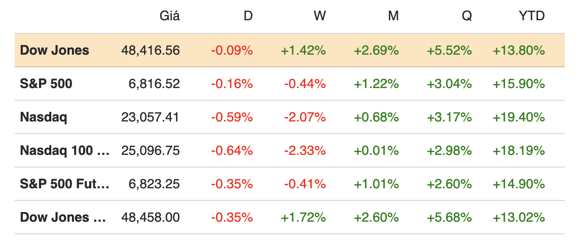 Khép phiên ngày 15/12, chỉ số S&P 500 giảm 0.16%, chốt phiên ở mức 6,816.51 điểm sau khi mở cửa trong sắc xanh. Chỉ số Dow Jones Industrial Average giảm 41.49 điểm, tương đương 0.09%, xuống 48,416.56 điểm, trong khi Nasdaq Composite giảm 0.59% xuống 23,057.41 điểm.