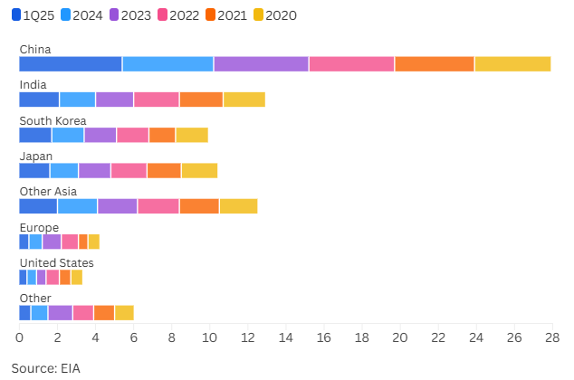 Lượng dầu thô và khí đốt được vận chuyển qua Eo biển Hormuz theo điểm đến