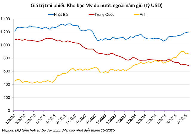 Trong nhiều thập kỷ, Nhật Bản không chỉ là nguồn cung cấp vốn rẻ cho các quỹ đầu cơ mà còn là người mua trung thành nhất đối với nợ công của Mỹ. Theo số liệu cập nhật đến tháng 10/2025, Nhật Bản đang là chủ nợ nước ngoài lớn nhất của Mỹ khi nắm giữ 1.2 ngàn tỷ USD trái phiếu Kho bạc (Treasuries).