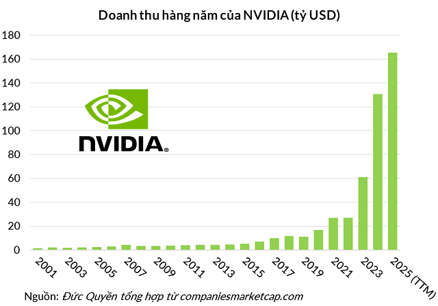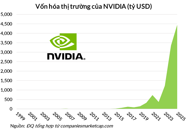 Chỉ trong vòng chưa đầy hai năm, giá trị vốn hóa của Nvidia đã tăng từ dưới 1,000 tỷ USD lên hơn 4,000 tỷ USD. Nvidia không chỉ là doanh nghiệp có vốn hóa lớn nhất thế giới hiện nay mà còn lớn nhất lịch sử từ trước tới nay.