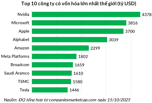 Tính đến tháng 10/2025, Nvidia chiếm 7.28% vốn hóa S&P 500, chỉ số gồm 500 doanh nghiệp niêm yết lớn nhất nước Mỹ. Tỷ trọng của riêng cổ phiếu Nvidia trong chỉ số MSCI World Index, bao gồm các công ty lớn nhất từ 47 quốc gia, là 5.04%, vượt qua tỷ trọng của toàn bộ thị trường chứng khoán Nhật Bản (4.78%).