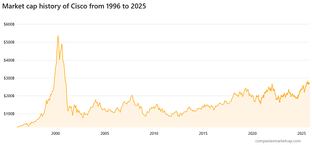 Nhưng khi bong bóng dot-com vỡ tung, giá cổ phiếu Cisco đã sụp đổ 86% và phải mất hơn 20 năm mới quay lại đỉnh cũ, còn vốn hóa hiện nay thì vẫn thua xa năm 2000.