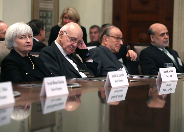 ![]() Các quan chức Cục Dự trữ Liên bang Janet Yellen, Paul Volcker (đã mất năm 2019), Alan Greenspan và Ben Bernanke được chụp ảnh cùng nhau vào năm 2013 tại một sự kiện kỷ niệm 100 năm thành lập ngân hàng trung ương.