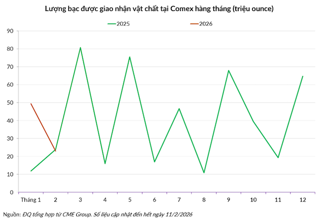 Dữ liệu từ Comex cho thấy, lượng bạc thực tế được bàn giao trong tháng 2/2026 tính đến ngày 11/02 là xấp xỉ 23 triệu ounce, tương đương với lượng bàn giao của toàn bộ tháng 2/2025.