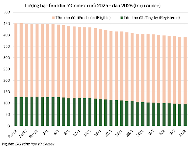 Tuy nhiên, xu hướng từ cuối năm 2025 đến nay là bạc bị hủy chứng quyền giao nhận, chuyển trạng thái từ Registered sang Eligible rồi rút hoàn toàn ra khỏi kho Comex. Bằng chứng và cũng là hệ quả của hiện tượng rút kho này là tổng lượng tồn kho (bao gồm cả Registered và Eligible) của Comex đã sụt giảm từ mức 450 triệu ounce hồi đầu năm xuống còn 391 triệu ounce vào ngày 11/2. Gần 60 triệu ounce bạc đã biến mất khỏi các hầm chứa chỉ trong vòng chưa đầy 6 tuần đầu năm.