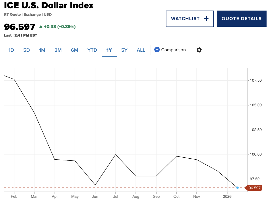 Chỉ số đồng USD, đo lường sức mạnh đồng bạc xanh so với rổ tiền tệ chính, đã giảm 2.2% từ đầu năm đến nay, sau khi sụt hơn 9% trong năm 2025.