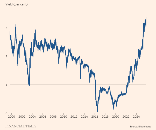 Lợi suất trái phiếu Chính phủ Nhật Bản 30 năm đã tăng vọt từ 1.6% đầu năm ngoái lên chạm mức cao kỷ lục 3.41% trong tuần trước, khi lạm phát và lãi suất gia tăng. Trong khi đó, lợi suất trái phiếu 20 năm nhảy vọt từ 1.39% lên 2.88% – mức chưa thấy kể từ năm 1999.