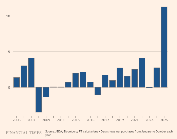 Theo dữ liệu từ Hiệp hội Đại lý Chứng khoán Nhật Bản, trong 10 tháng đầu năm, các nhà đầu tư nước ngoài đã mua ròng 11.3 ngàn tỷ Yên (71.8 tỷ USD) trái phiếu Chính phủ Nhật Bản có kỳ hạn trên 10 năm – cao hơn bất kỳ giai đoạn tương đương nào kể từ khi bắt đầu ghi nhận vào năm 2004.