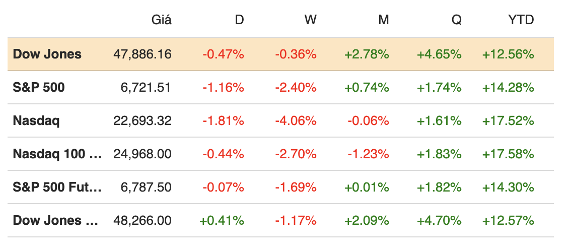 Khép phiên ngày 17/12, chỉ số S&P 500 giảm 1.16% xuống 6,721.43 điểm, trong khi Nasdaq Composite mất 1.81%, chốt phiên tại 22,693.32 điểm. Chỉ số Dow Jones Industrial Average giảm 228.29 điểm, tương đương 0.47%, xuống còn 47,885.97 điểm.