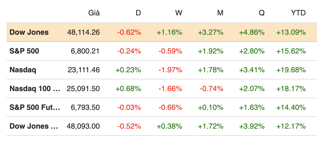Khép phiên ngày 16/12, chỉ số S&P 500 giảm 0.24%, chốt phiên ở mức 6,800.26 điểm, trong khi Nasdaq Composite tăng 0.23%, kết phiên tại 23,111.46 điểm. Chỉ số Dow Jones Industrial Average giảm 302.30 điểm, tương đương 0.62%, đóng cửa ở mức 48,114.26 điểm.