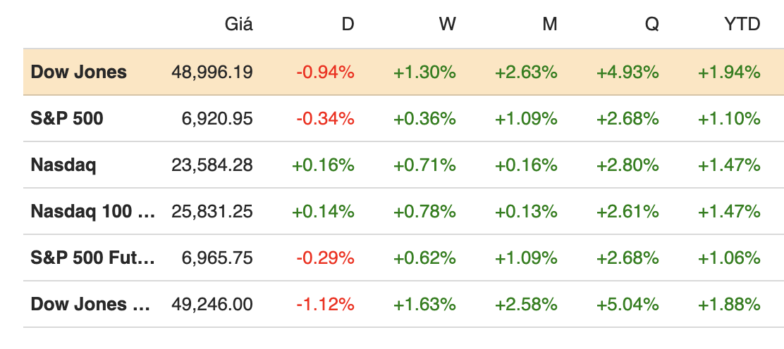 Khép phiên ngày 07/01, chỉ số S&P 500 giảm 0.34%, đóng cửa tại 6,920.93 điểm. Chỉ số Dow Jones mất 466 điểm, tương đương 0.94%, kết phiên ở mức 48,996.08 điểm. Trước đó trong phiên, cả hai chỉ số đều đã thiết lập mức cao kỷ lục mới. Nasdaq Composite đi ngược xu hướng, tăng 0.16% và đóng cửa tại 23,584.27 điểm.