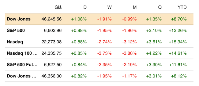 Kết thúc phiên giao dịch ngày 21/11, chỉ số Dow Jones tăng 493.15 điểm (tương đương 1.08%) lên 46,245.41 điểm. Chỉ số Nasdaq Composite cộng 0.88% lên 22,273.08 điểm, còn chỉ số S&P 500 tiến 0.98% lên 6,602.99 điểm.