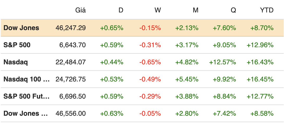 Kết thúc phiên giao dịch ngày 26/09, chỉ số Dow Jones tăng 299.97 điểm (0.65%) lên 46,247.29 điểm. S&P 500 tiến 0.59% lên 6,643.70 điểm, trong khi Nasdaq Composite tăng 0.44% lên 22,484.07 điểm.