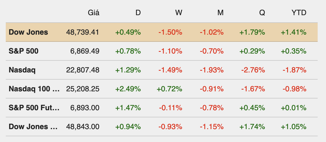 Khép phiên ngày 04/03, chỉ số Dow Jones Industrial Average tăng 238.14 điểm, tương đương 0.49%, đóng cửa ở 48,739.41 điểm, chấm dứt chuỗi ba phiên giảm liên tiếp. S&P 500 tăng 0.78% lên 6,869.50 điểm, trong khi Nasdaq Composite tăng 1.29% lên 22,807.48 điểm.