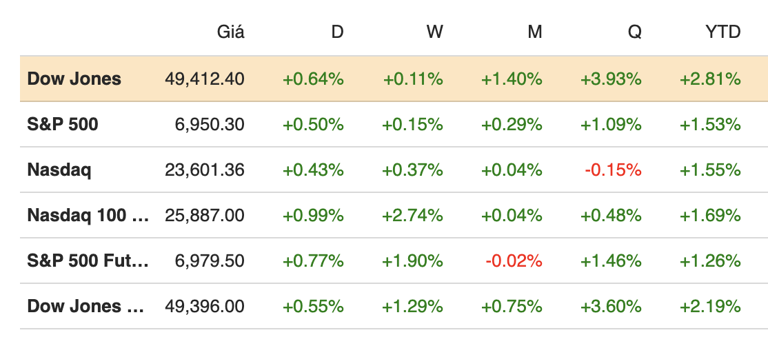 Khép phiên ngày 26/01, chỉ số S&P 500 tăng 0.50%, chốt phiên tại 6,950.23 điểm. Dow Jones tăng 313.69 điểm, tương đương 0.64%, đóng cửa ở 49,412.40 điểm. Nasdaq Composite tăng 0.43%, lên 23,601.36 điểm. Chỉ số thiên về công nghệ này được hỗ trợ bởi đà tăng của cổ phiếu Apple, Meta Platforms và Microsoft trước thềm công bố kết quả kinh doanh vào cuối tuần.