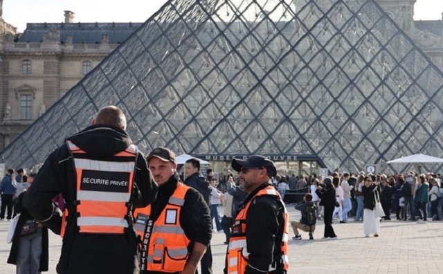 Lực lượng an ninh gác bên ngoài bảo tàng Louvre ở thủ đô Paris, Pháp. (Nguồn: THX/TTXVN)
