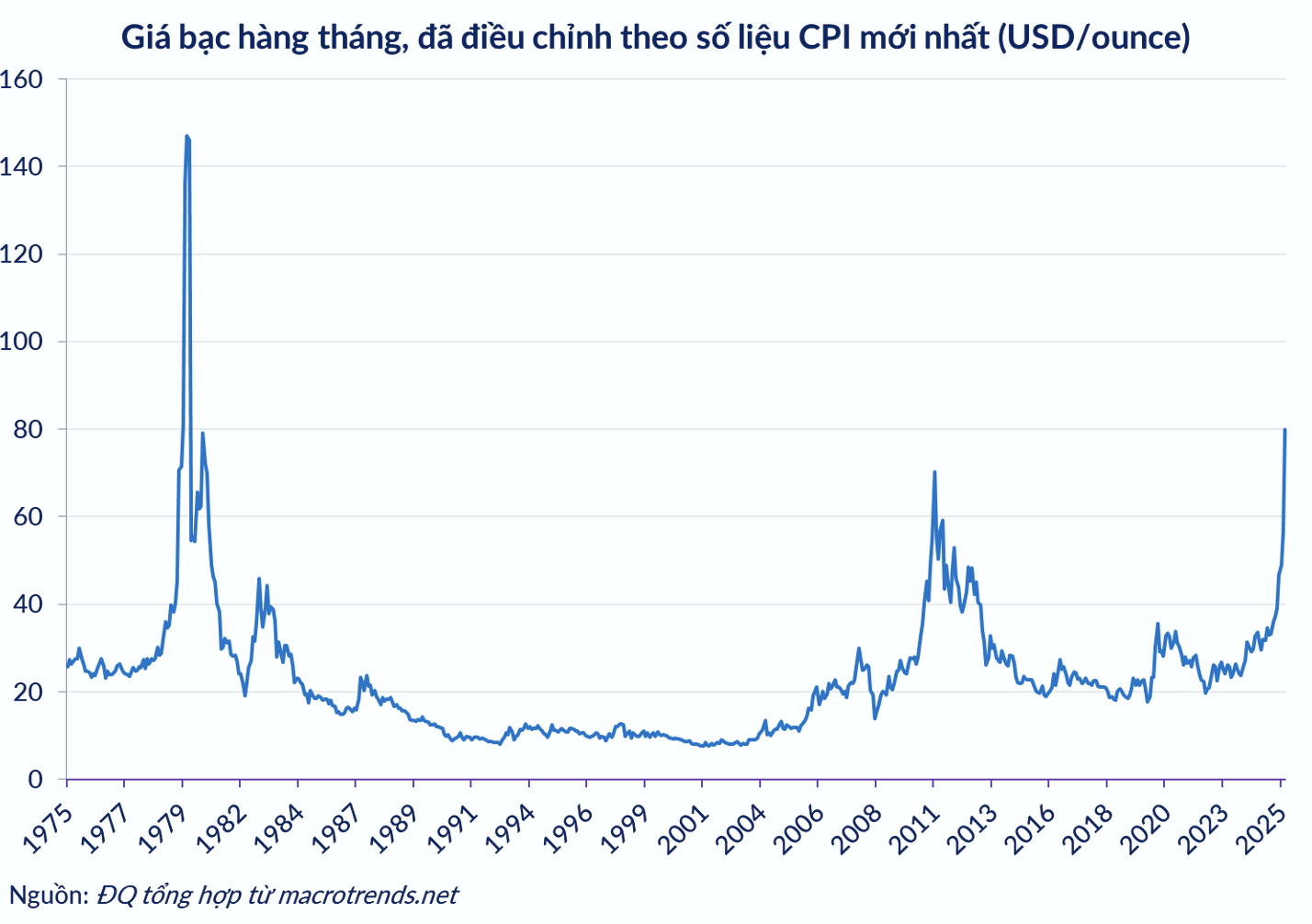 Nếu điều chỉnh theo lạm phát, mức giá 50 USD của năm 1980 tương đương với khoảng 180 USD theo thời giá năm 2025. Điều này cho thấy, ở mức giá 80 USD, bạc vẫn đang bị định giá thấp so với sức mua thực tế của nó trong lịch sử.