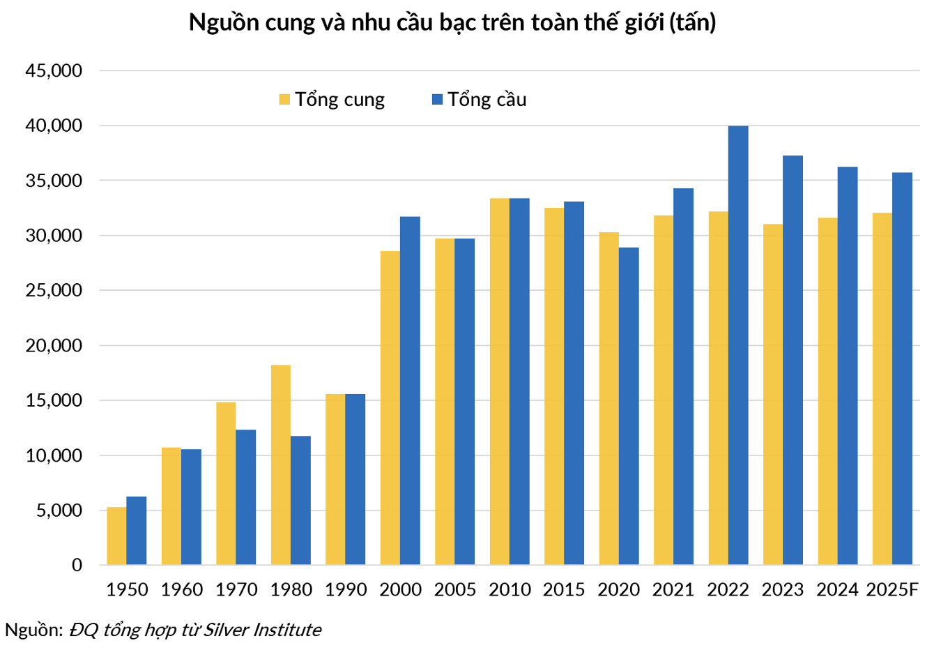 Từ năm 2010 đến 2022, nhu cầu bạc tăng 20%, trong khi nguồn cung giảm 4%.