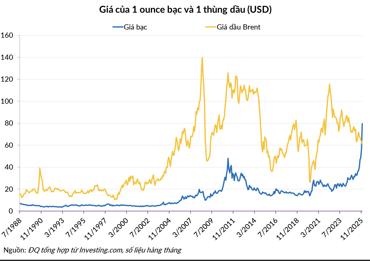 Trong suốt thế kỷ 20, dầu mỏ được mệnh danh là “Vàng đen”, là thước đo quyền lực địa chính trị và sức khỏe kinh tế toàn cầu. Tuy nhiên khi năm 2025 khép lại, một thực tế mới đã được xác lập. Trong khi giá dầu thô WTI chật vật quanh ngưỡng 60-65 USD/thùng do tình trạng dư cung kinh niên, thì giá bạc đã thực hiện cú bứt phá ngoạn mục lên đỉnh lịch sử 80 USD/ounce.