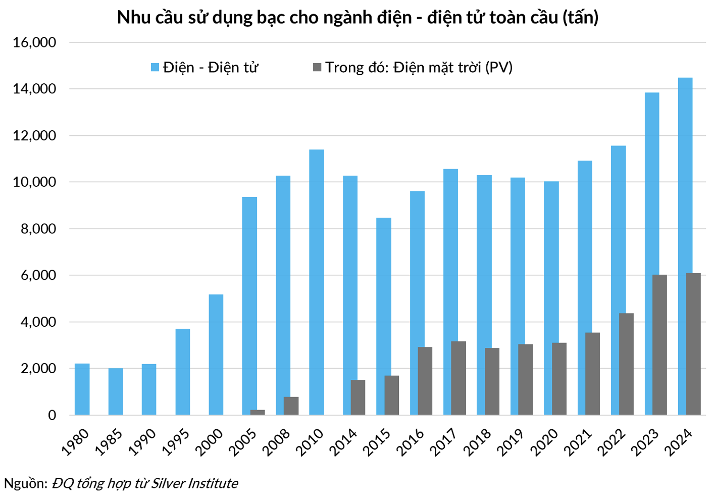 Theo số liệu từ Silver Institute, ngành năng lượng mặt trời (Photovoltaics – PV) đã trở thành một “hố đen” hút bạc, chiếm tới 29% tổng nhu cầu công nghiệp vào năm 2024. Các cam kết Net-Zero của Mỹ, Liên minh Châu Âu và Trung Quốc đã biến nhu cầu bạc trở thành một xu hướng bắt buộc, không phụ thuộc vào giá cả.