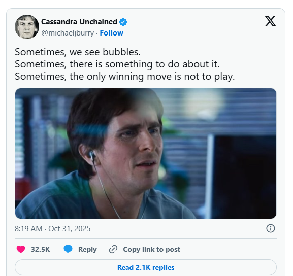 Người đàn ông nổi tiếng từ bộ phim “The Big Short” vừa đăng bài trên X lần đầu tiên kể từ tháng 4/2023 vào ngày 30/10. Ông chia sẻ một hình ảnh từ bộ phim với diễn viên Christian Bale, người đóng vai ông Burry trong “The Big Short”, đang nhìn chằm chằm vào màn hình máy tính với vẻ khó tin.