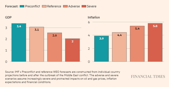 Ở kịch bản cơ sở – được xây dựng trước khi đàm phán thất bại – IMF dự báo tăng trưởng toàn cầu đạt 3.1% và lạm phát ở mức 4.4%, với giả định xung đột sớm hạ nhiệt và giá dầu quay về gần mức trước khủng hoảng. Năm 2025, kinh tế toàn cầu tăng trưởng 3.5% và lạm phát ở mức 4.1%. IMF cho biết nếu không có chiến tranh, tổ chức này thậm chí đã cân nhắc nâng dự báo tăng trưởng.