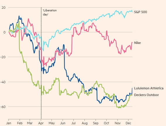 Thuế quan Trump, áp lực chi phí lên người tiêu dùng, cùng những sai lầm về sản phẩm và cạnh tranh gia tăng đã tạo nên cơn bão hoàn hảo với Lululemon. Không chỉ riêng Lululemon, toàn ngành bán lẻ Mỹ đều gặp khó khăn với Deckers Outdoor giảm 51% và Nike mất 24%.