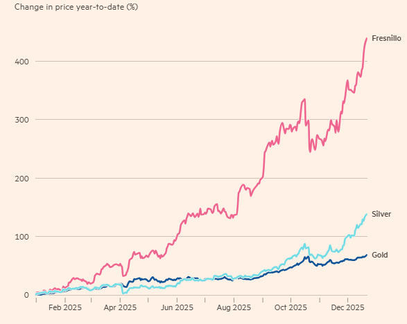 Nếu phải chọn ra biểu tượng cho cơn sốt kim loại quý năm 2025, Fresnillo chính là ứng cử viên sáng giá nhất. Nhà sản xuất bạc có trụ sở tại Mexico City này đã tăng gấp 5 lần giá trị, trở thành cổ phiếu hoạt động xuất sắc nhất trong chỉ số FTSE 100 danh giá của London.