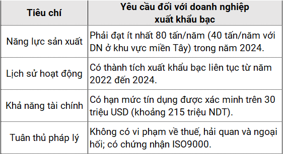 Về lý thuyết, Trung Quốc không cấm hoàn toàn xuất khẩu bạc. Tuy nhiên, Bắc Kinh đã thiết lập các rào cản kỹ thuật và tài chính để chỉ 44 doanh nghiệp nhà nước hoặc các tập đoàn lớn có sự kiểm soát của Chính phủ mới được phép tham gia xuất khẩu.