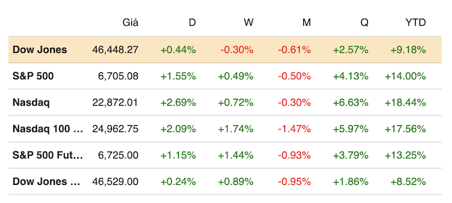 Kết thúc phiên giao dịch ngày 24/11, chỉ số S&P 500 tiến 1.55% lên 6,705.12 điểm, chỉ số Nasdaq Composite cộng 2.69% lên 22,872.01 điểm. Đây là phiên tốt nhất của Nasdaq Composite kể từ ngày 12/05, thời điểm đó chỉ số này vọt 4.35%. Chỉ số Dow Jones tăng 202.86 điểm (tương đương 0.44%) lên 46,448.27 điểm.