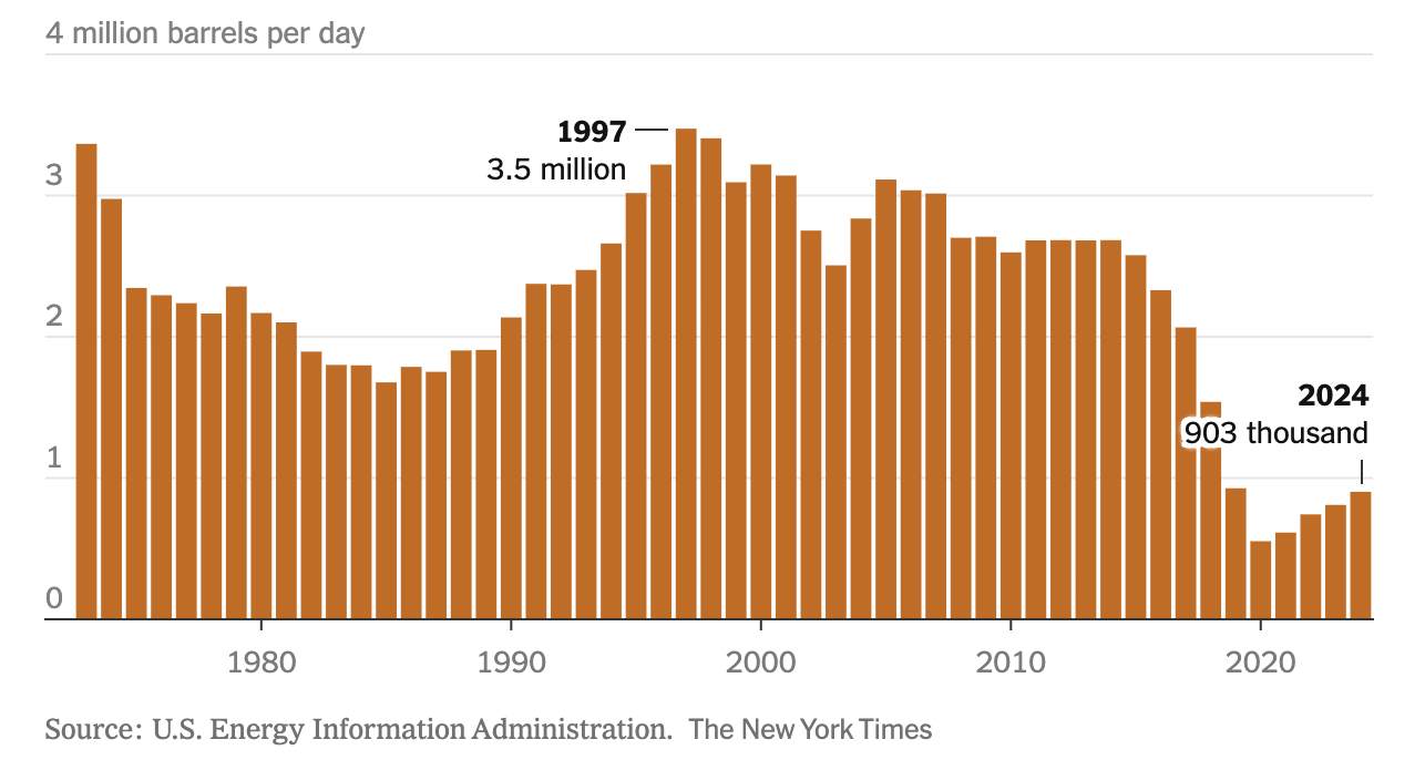 Ngành này đã phục hồi một phần trong những năm gần đây, nhưng sản lượng vẫn thấp hơn rất nhiều so với hơn 2 triệu thùng mỗi ngày vào đầu những năm 2010.