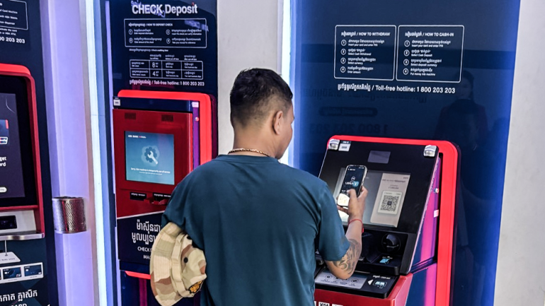 Một khách hàng sử dụng máy ATM của ABA Bank tại khu phố Toul Tom Poung, Phnom Penh, ngày 1/4. ABA Bank được xem là một trong những ngân hàng hoạt động lành mạnh nhất tại Campuchia. (Ảnh: Ananth Baliga)