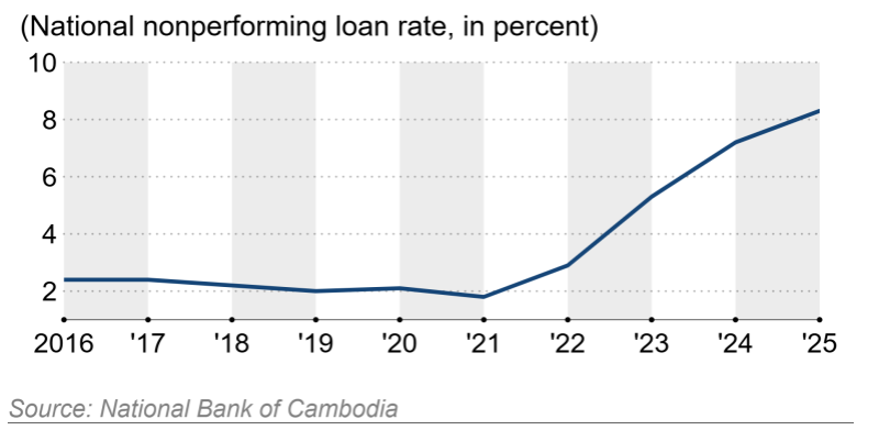 Các ngân hàng thương mại lớn như Acleda và ABA ghi nhận tỷ lệ nợ xấu lần lượt là 6.9% và 8.1%, trong khi các ngân hàng nhỏ có mức độ tiếp xúc lớn với cho vay vi mô ghi nhận tỷ lệ cao hơn. Khoảng 17.2% danh mục của Phillip Bank là nợ xấu, Prince Bank (vốn liên quan đến đế chế lừa đảo Trần Chí) là 28% và ngân hàng vi mô Hattha Bank (thuộc Thái Lan) ghi nhận 35.6% trong năm 2025.