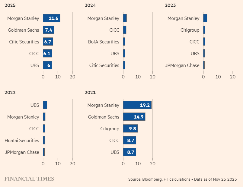 Các ngân hàng phương Tây là những bên hưởng lợi lớn nhất từ các đợt bán cổ phiếu tại Hồng Kông năm nay, bất chấp căng thẳng Mỹ – Trung, trong bối cảnh giao dịch sôi động trở lại. Theo dữ liệu Bloomberg, tính đến cuối tháng 11, Morgan Stanley đã tư vấn huy động 11.6 tỷ USD qua các đợt phát hành cổ phiếu; Goldman Sachs đứng thứ hai với 7.4 tỷ USD, theo sau là Citic, CICC và UBS.