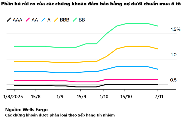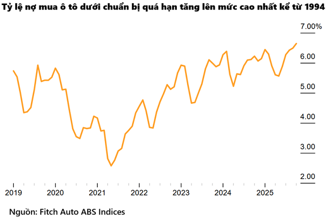 Ngày nay, một kịch bản tương tự đang âm thầm diễn ra trong thị trường cho vay mua ô tô. Theo thống kê của Fitch Ratings, tỷ lệ các khoản vay mua ô tô dưới chuẩn (cấp cho người có điểm tín dụng dưới 670) quá hạn trên 60 ngày đã tăng lên 6.65% vào tháng 10/2025, mức cao nhất kể từ khi dữ liệu bắt đầu được thu thập vào năm 1994.