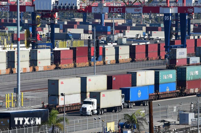 Container hàng hóa được bốc dỡ tại cảng Long Beach ở California (Mỹ). (Ảnh: AFP/TTXVN)