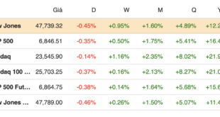 Phố Wall nhuốm sắc đỏ, Dow Jones giảm hơn 200 điểm Thị trường chứng khoán Mỹ đã có phiên giao dịch thận trọng trong ngày 08/12 khi nhà đầu tư chờ đợi cuộc họp cuối cùng trong năm của Fed. Nguồn: VietstockFinance Khép phiên ngày 08/12, S&P 500 giảm 0.35% …