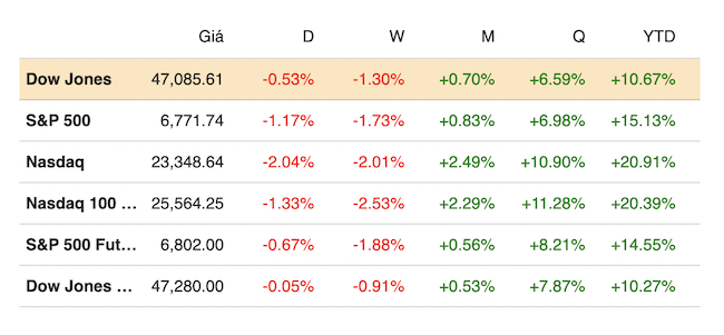 Kết thúc phiên giao dịch ngày 04/11, chỉ số S&P 500 lùi 1.17% xuống 6,771.55 điểm, còn chỉ số Nasdaq Composite mất 2.04% còn 23,348.64 điểm. Chỉ số Dow Jones rớt 251.44 điểm (tương đương 0.53%) xuống 47,085.24 điểm.