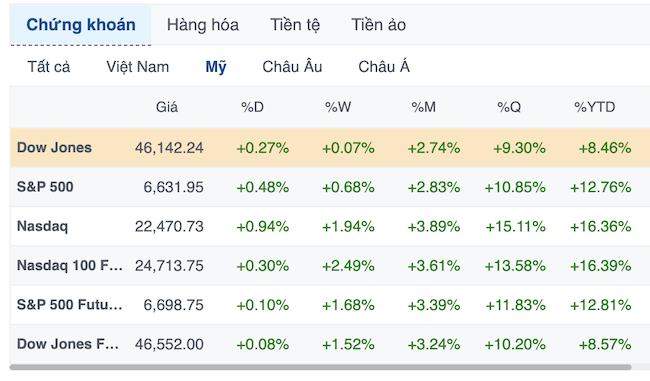 Kết thúc phiên giao dịch ngày 18/09, chỉ số S&P 500 tiến 0.48% lên 6,631.96 điểm, chỉ số Nasdaq Composite cộng 0.94% lên 22,470.73 điểm. Chỉ số Dow Jones tăng 124 điểm (tương đương 0.27%) lên 46,142.42 điểm.