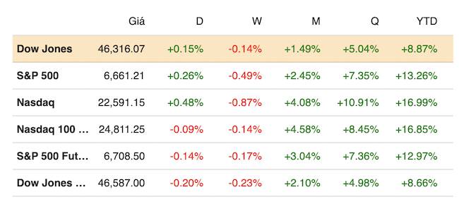 Kết thúc phiên giao dịch ngày 29/09, chỉ số S&P 500 tiến 0.26% lên 6,661.21 điểm, chỉ số Nasdaq Composite cộng 0.48% lên 22,591.15 điểm. Chỉ số Dow Jones tăng 68.78 điểm (tương đương 0.15%) lên 46,316.07 điểm.