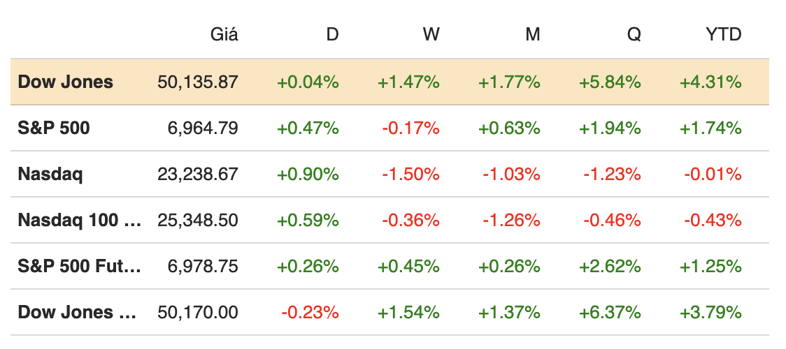 Khép phiên ngày 09/02, chỉ số S&P 500, nhích 0.47% và đóng cửa tại 6,964.82 điểm. Chỉ số Dow Jones tăng nhẹ 20.20 điểm, tương đương 0.04%, lên 50,135.87 điểm. Dow Industrials thiết lập mức đỉnh trong phiên và kỷ lục đóng cửa mới. Trong khi đó, Nasdaq Composite bật tăng 0.9%, chốt phiên tại 23,238.67 điểm.