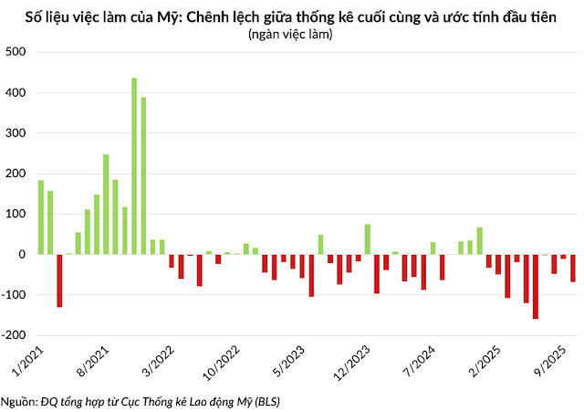 Số liệu việc làm của BLS thường xuyên được điều chỉnh giảm so với lần công bố đầu tiên, thể hiện qua số cột màu đỏ nhiều hơn áp đảo so với số cột màu xanh trong giai đoạn 2022-2025.